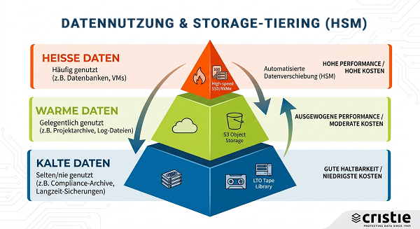 Ein modernes HSM-System stellt sicher, dass teurer Hochleistungs-Storage nur für aktive Workloads genutzt wird, während inaktive Daten auf kostengünstigere Speicherstufen verschoben werden.